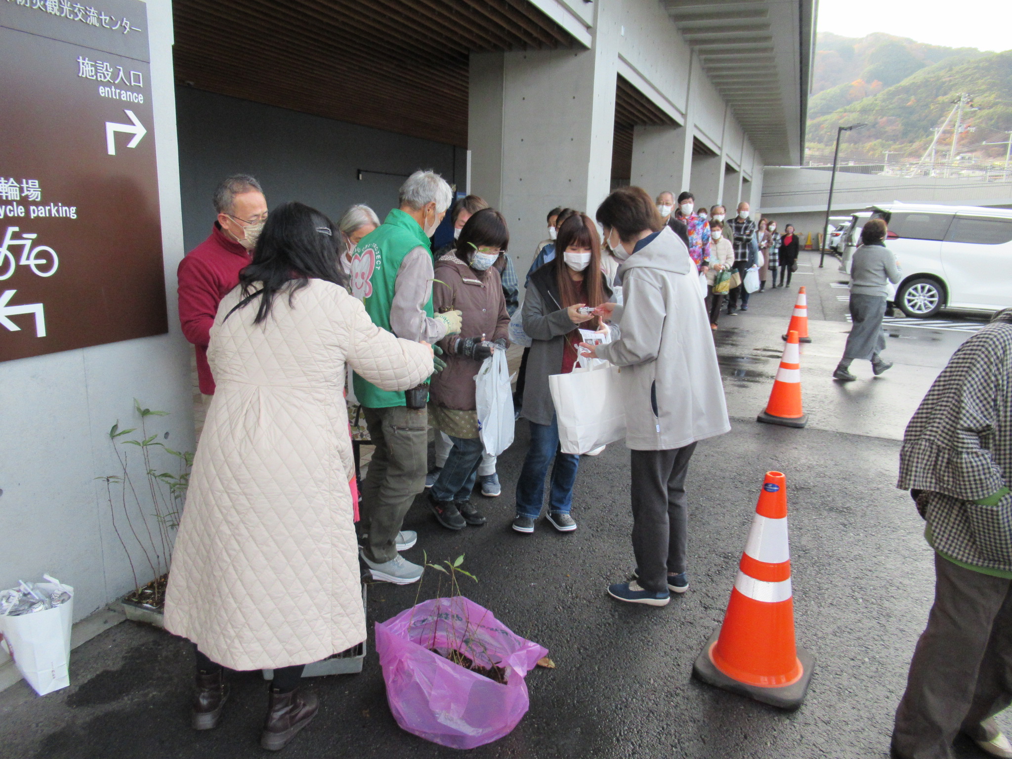 11月21日(月)おおふなぽーとのピロティにて、ハナモモの苗木をご希望されていた50名の方々に無料で配布しました。