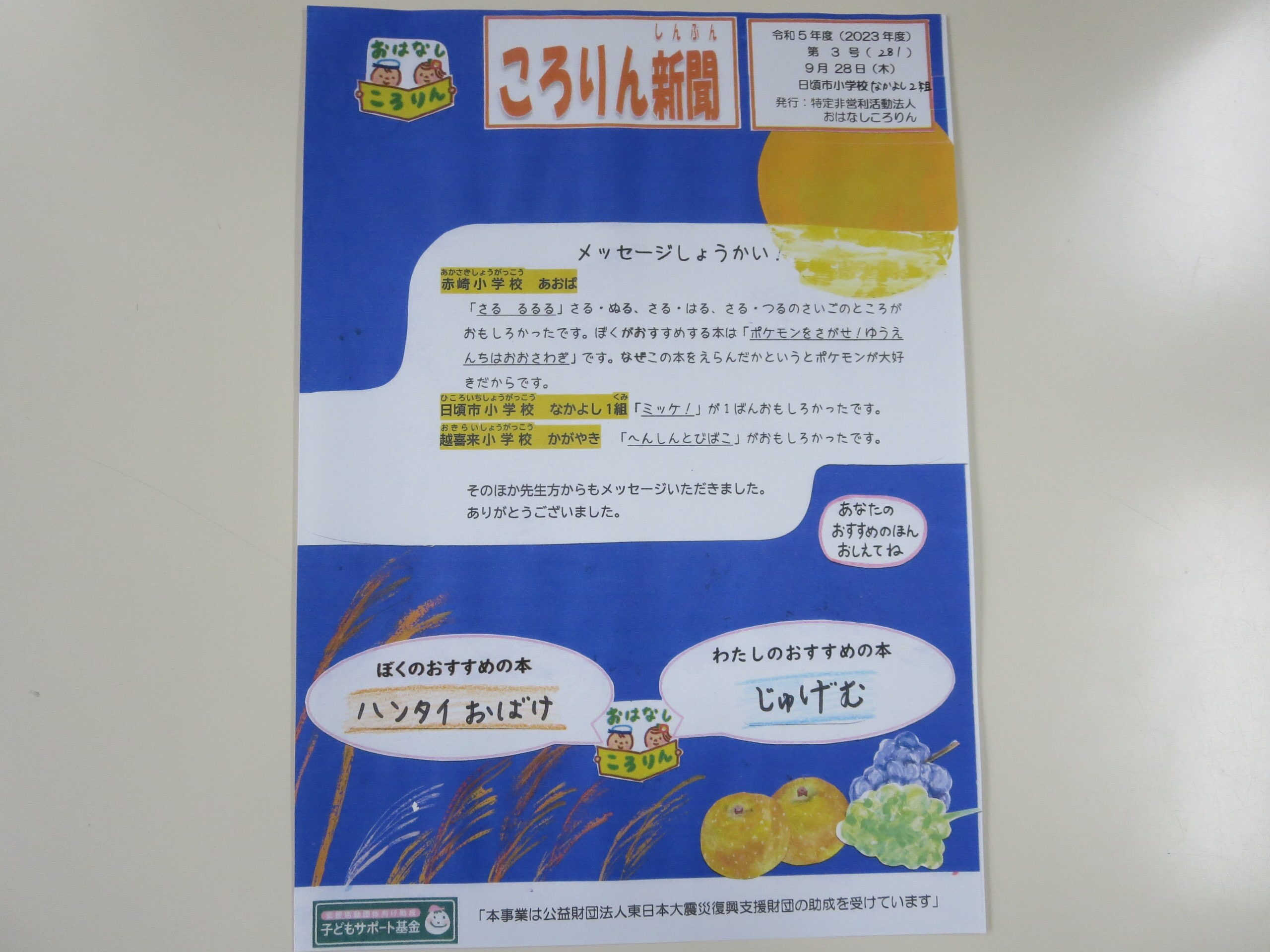 ころりん新聞の3号-①(8月発行)は、赤とんぼと夏野菜でしたが、②は9月配本の学校(立根小学校、北小学校、吉浜小学校、日頃市小学校)に、お月さまと秋の果物をテーマにしました。次の新聞発行まで教室の壁に貼ってもらいます。