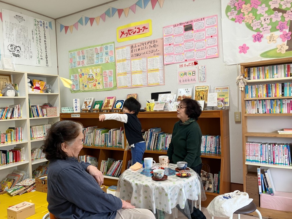 おはなしサロンに初めて来てくれた1歳11ヶ月の男の子。「人見知りで…」とお母さんが言っていましたが、いつも来る4歳の男の子がお世話をしてくれたのでリラックスして、2人の世界を作って仲良く遊んでいました。「また、来ますね」と笑顔で帰られた親子。いつでも遊びに来てくださいね、待ってます。
