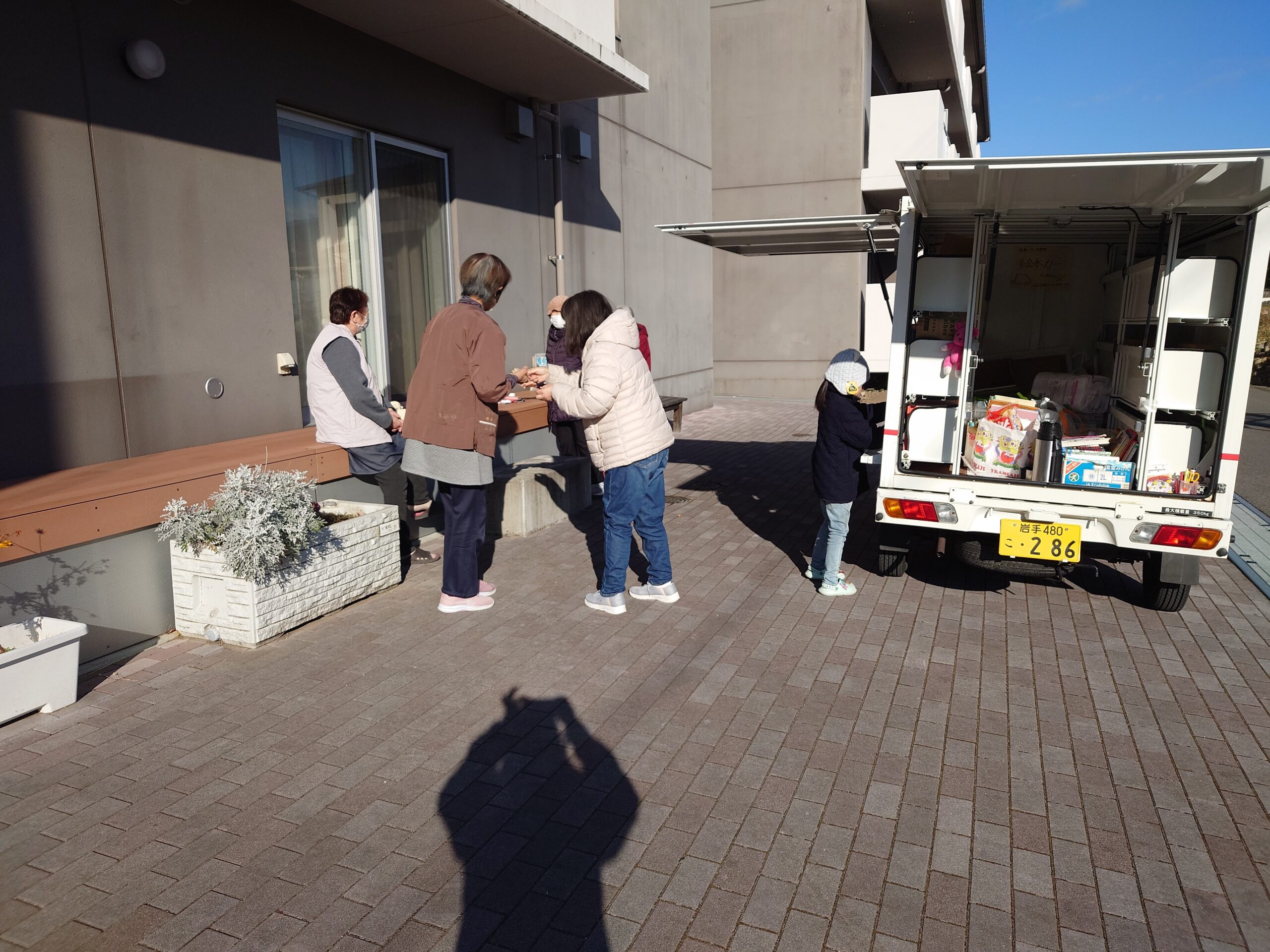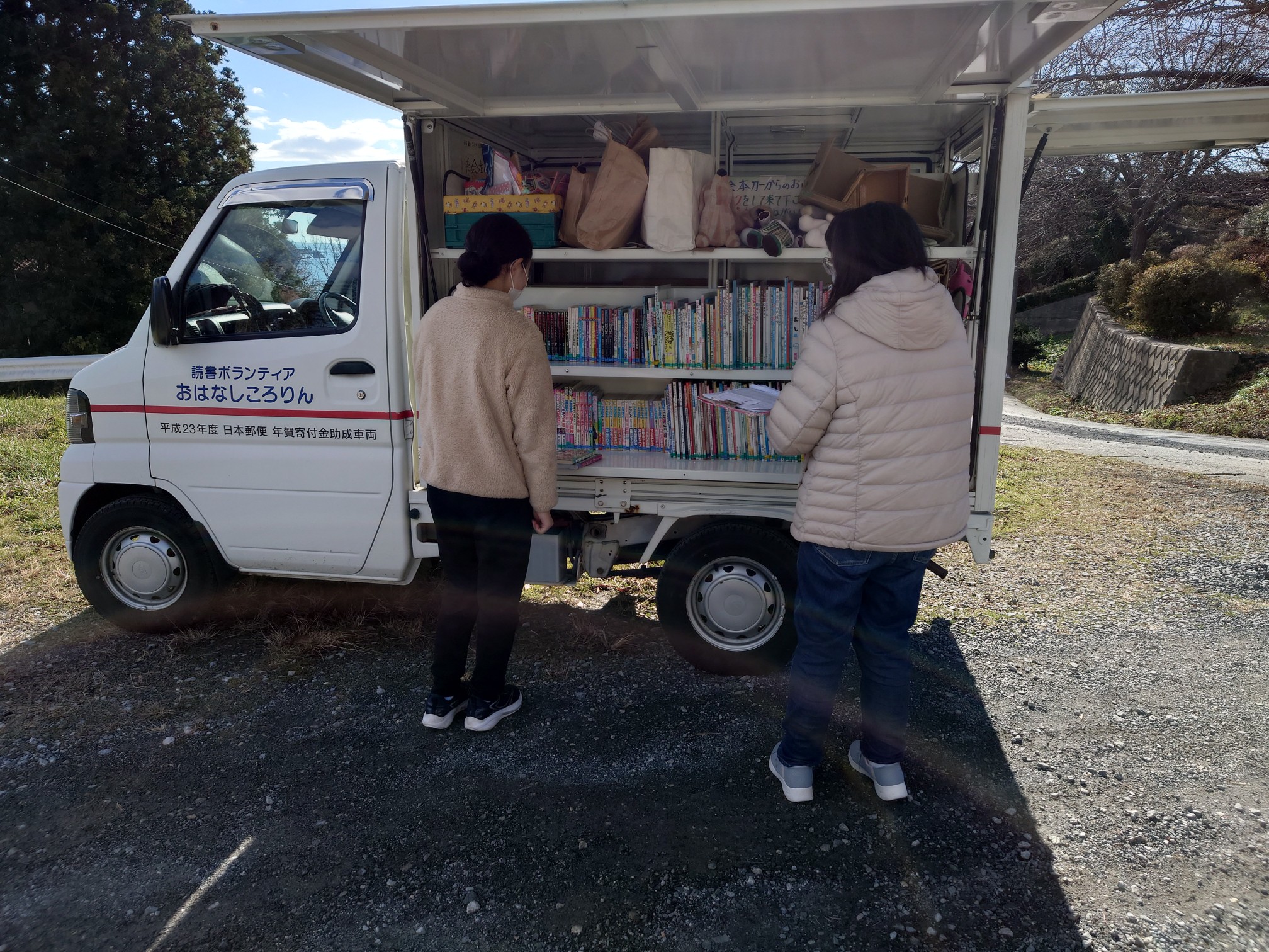 師走に入り、寒さも厳しくなってきましたが、巡回先の大船渡小学校には、1組の親子が来てくれました。「冬休みに入るので絵本を借りに来た」と姉弟が話していました。冬休みはどんなことするのかな?これからクリスマス、お正月とお楽しみがいっぱいだね。回っているうちにぽかぽか陽気になりその後もたくさんの方々に利用していただきました。