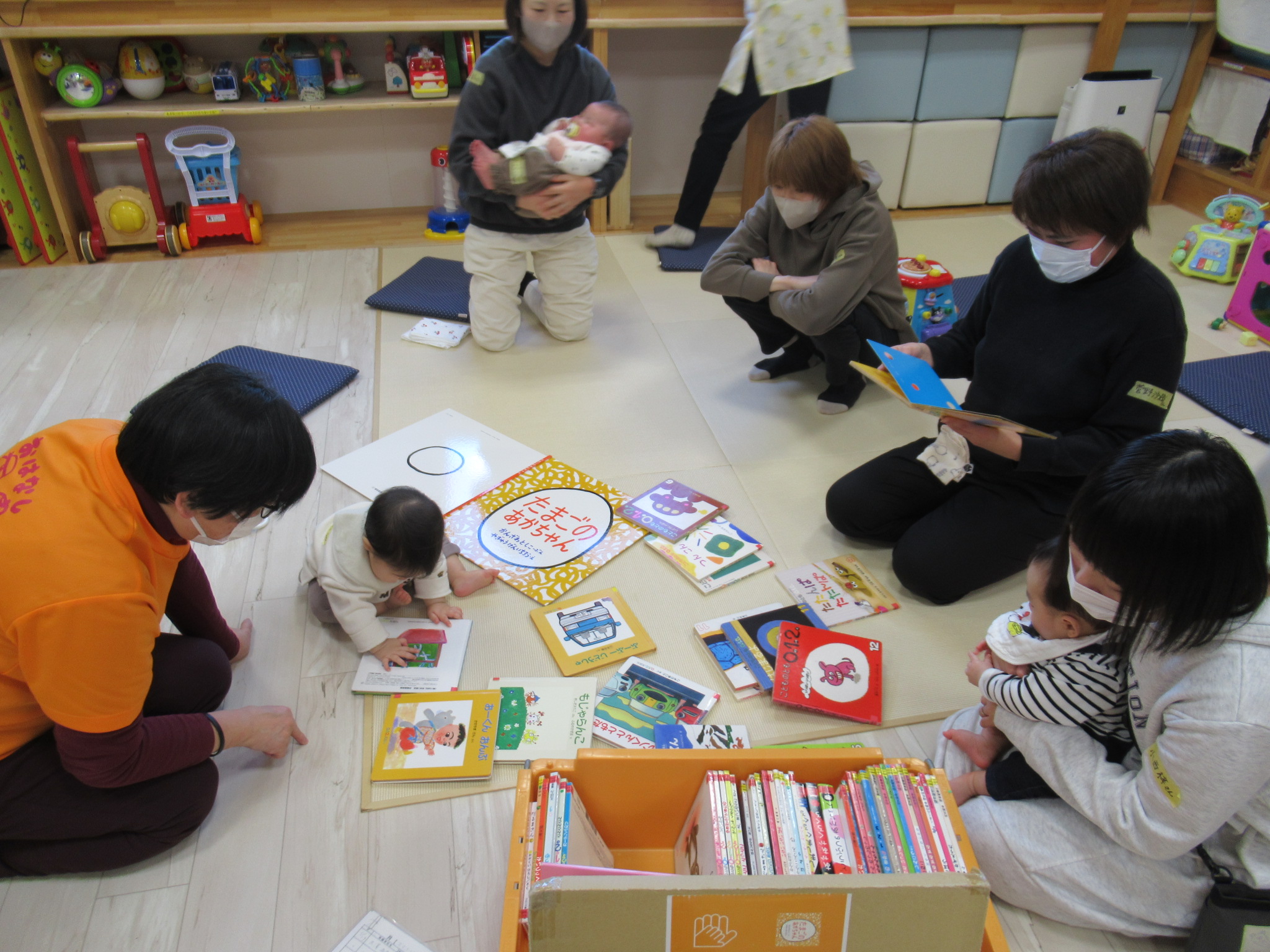お子さんとふれあいながら、お話会を楽しみました。妊婦さんには等身大サイズのあかちゃんお人形も貸していただき、一緒に楽しむことが出来ました。あかちゃんへの本を読み聞かせや絵本についてのお話もありました。