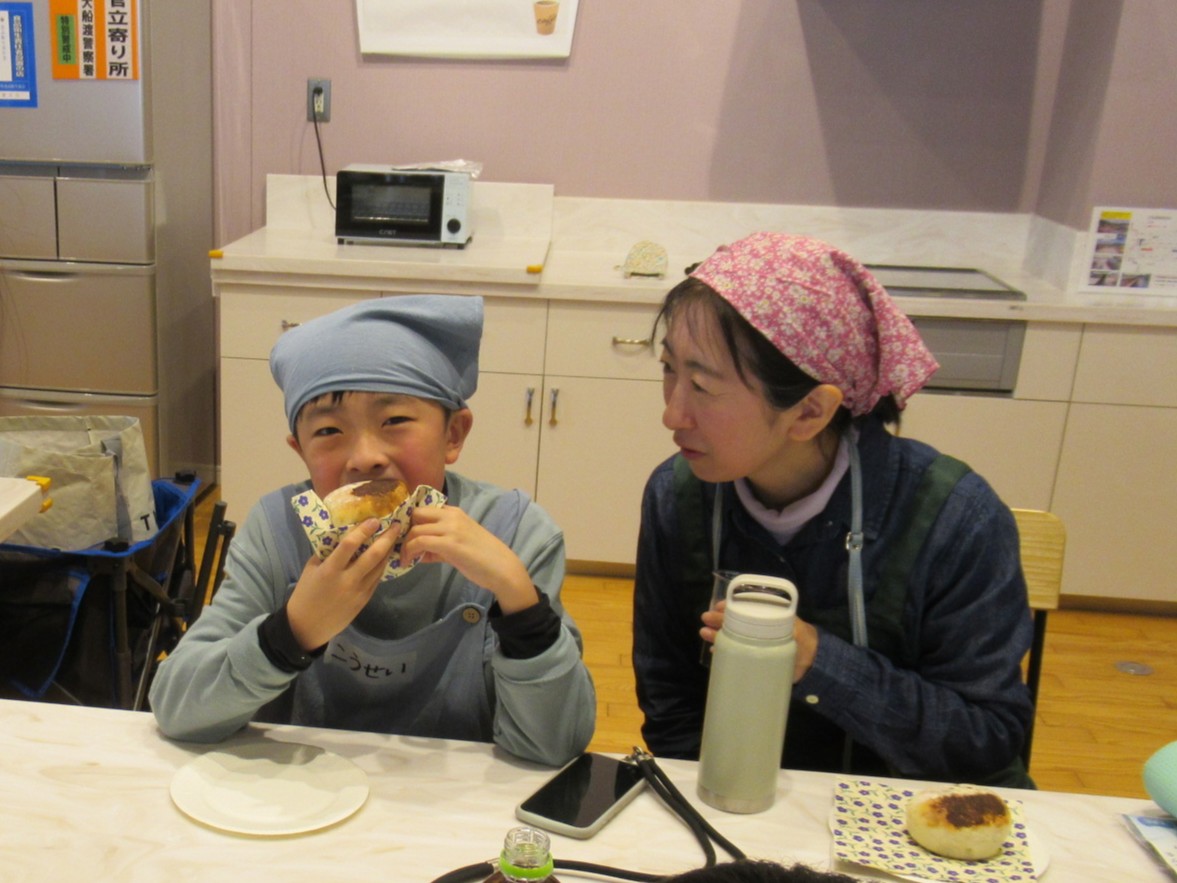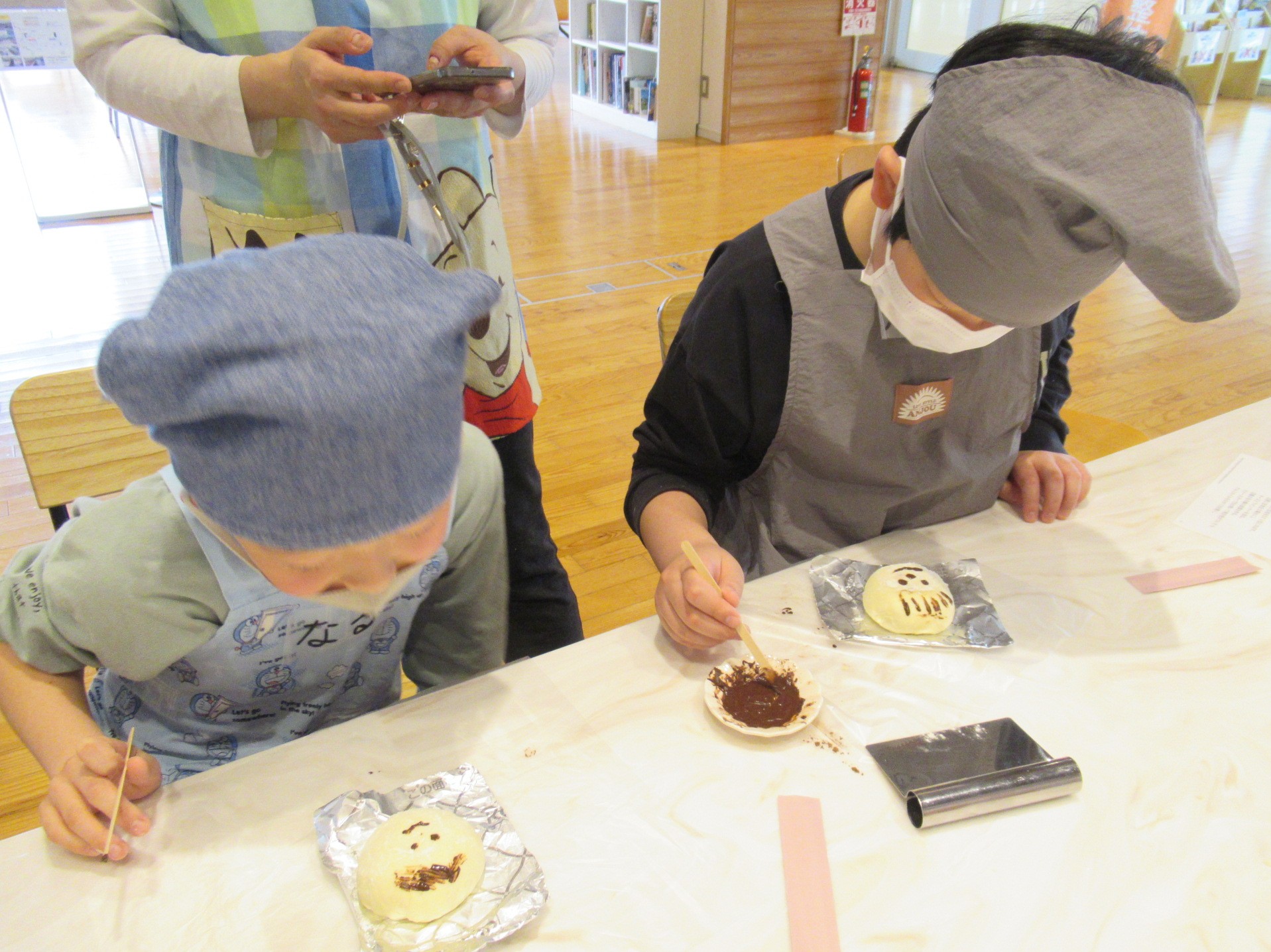 中に具を入れ、ココアで顔を描き焼き上げると、とっても可愛いパンが完成し、熱々をいただきました。とても美味しいと大好評でした。