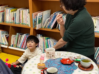 おはなしサロンでは4歳の男の子が、いつも利用してくださるお客さんに紙芝居を読んでもらったり、今の時代ではあまり遊ばなくなった独楽回しなどで遊んでもらっています。独楽の回し方を教えられ、得意げに回してい...