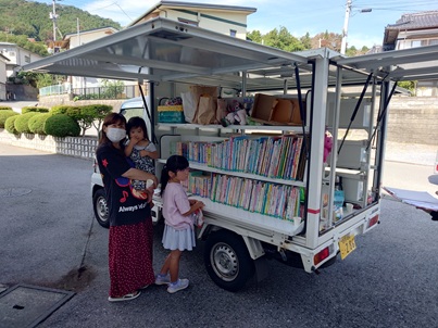 暑さもまだまだ残っていた9月初めの絵本カーの巡回では、かわいいお客さまたちがたくさん来てくれました。