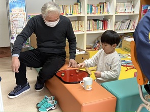 おはなしサロンに初めて来てくれた1歳11ヶ月の男の子。「人見知りで…」とお母さんが言っていましたが、いつも来る4歳の男の子がお世話をしてくれたのでリラックスして、2人の世界を作って仲良く遊んでいました。「ま...