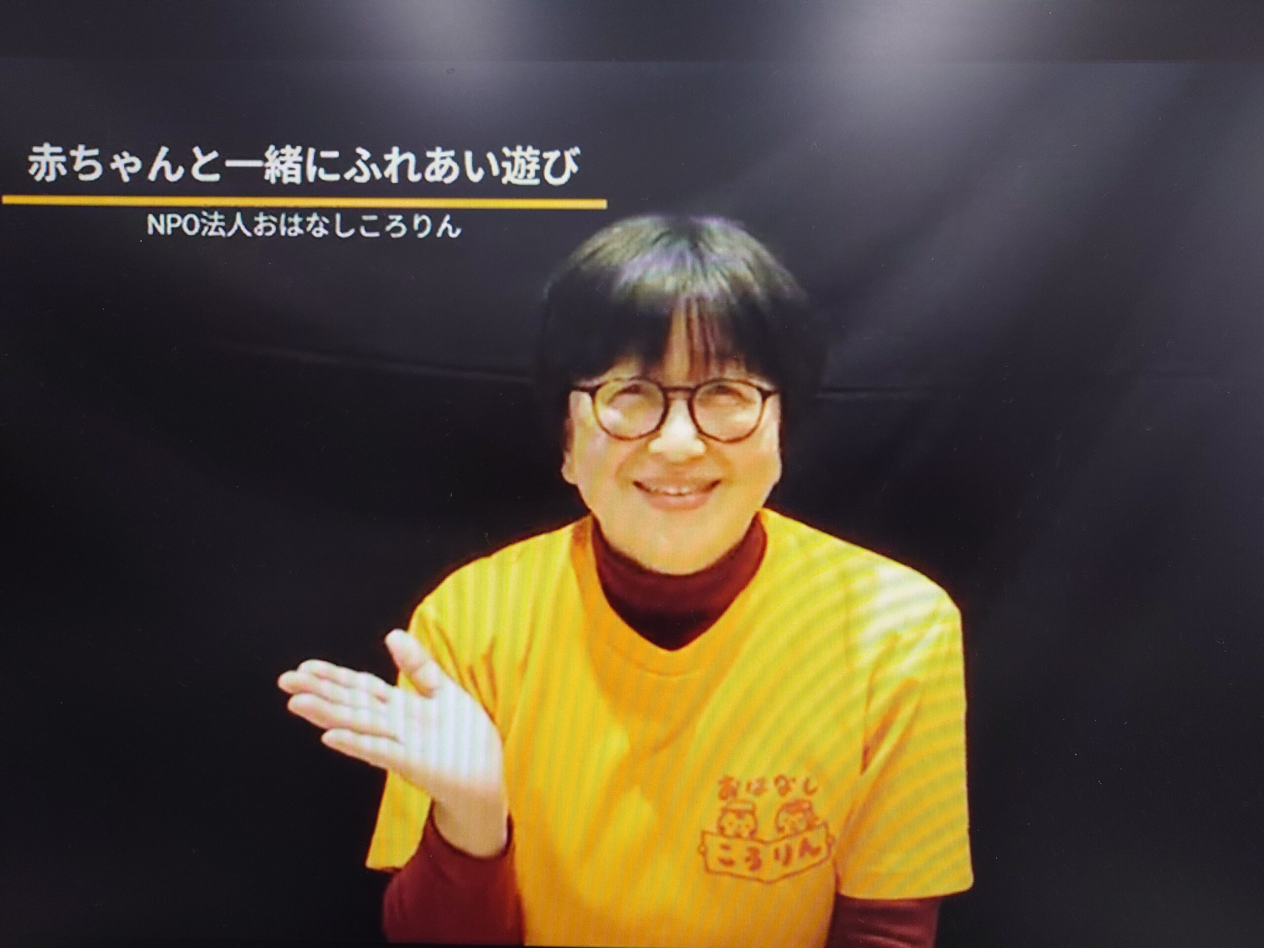 親子でわらべ歌に合わせて”あんよ“を動かし、軍手人形「おはながわらった」を歌いながら人形を揺らす...
