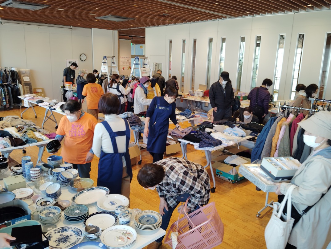 バザー開始とともに大勢のお客様が掘り出し物を見つけようと来場して大盛況!雑貨・日用品・衣類・タオル類・中古本(...