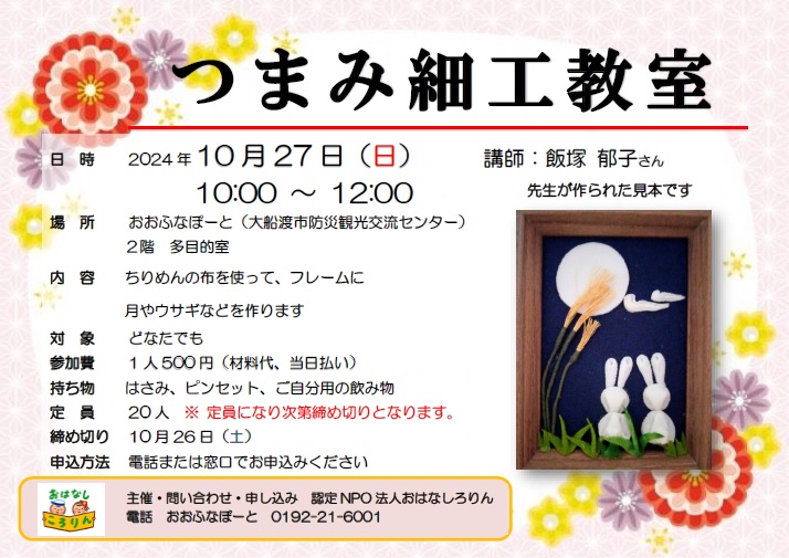 毎回大人気のつまみ細工教室。今回は秋の季節感たっぷりの『お月見のフレーム』を作ります。お月さまを愛でる2匹のうさぎのうしろ姿がとても可愛らしいですね。みなさまのご参加をお待ちしています。