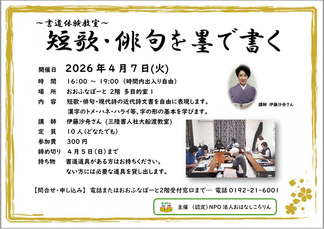 講師 :伊藤沙舟さん (三陸書人社大船渡教室)