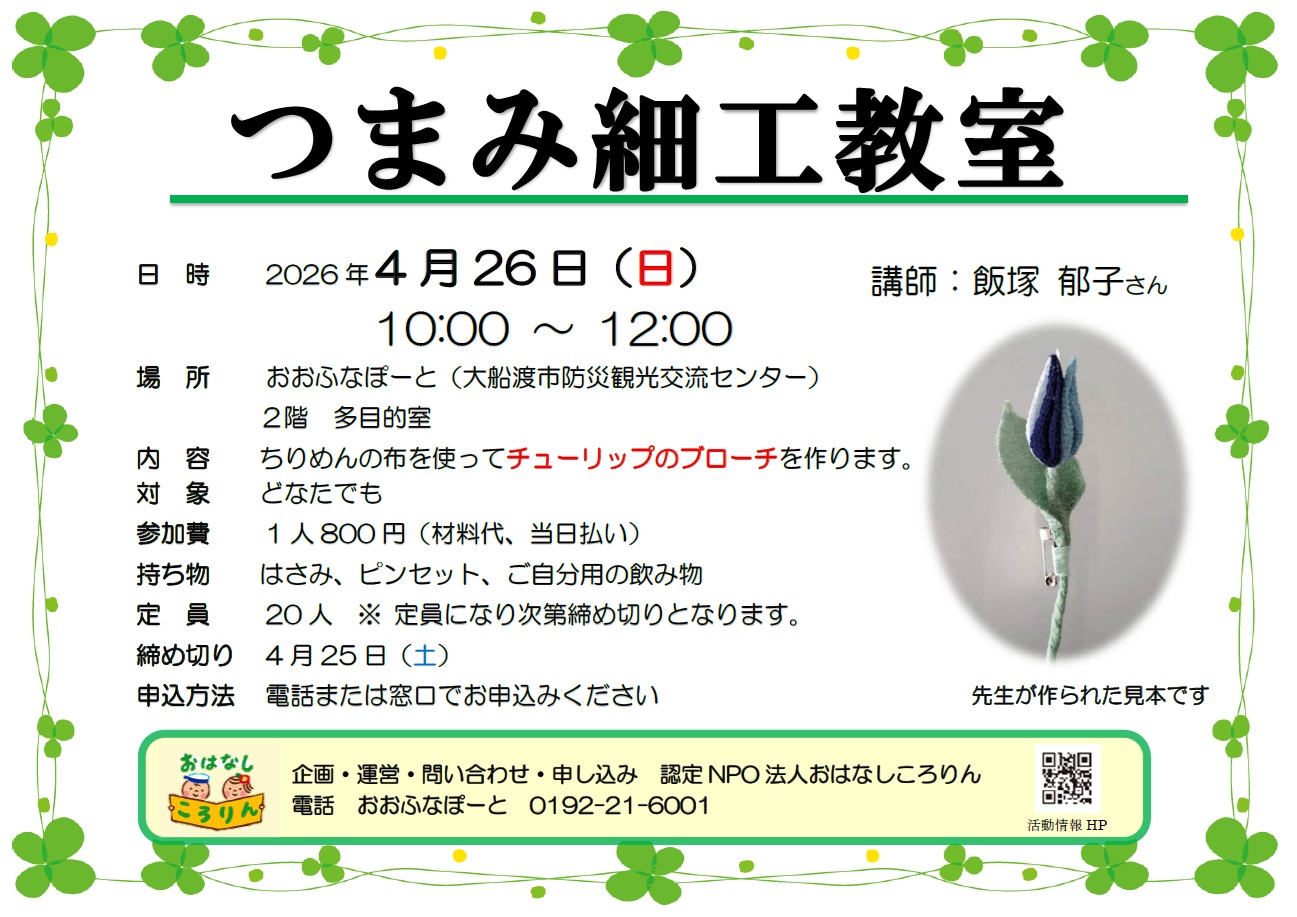 内 容 ちりめんの布を使ってチューリップのブローチを作ります。